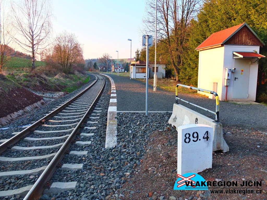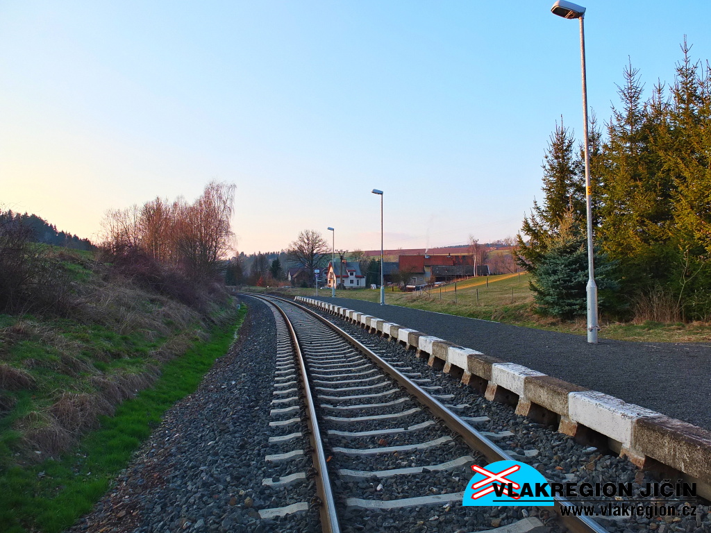 Bělá u Staré Paky - konec nástupiště na turnovské straně (3/2016)