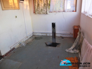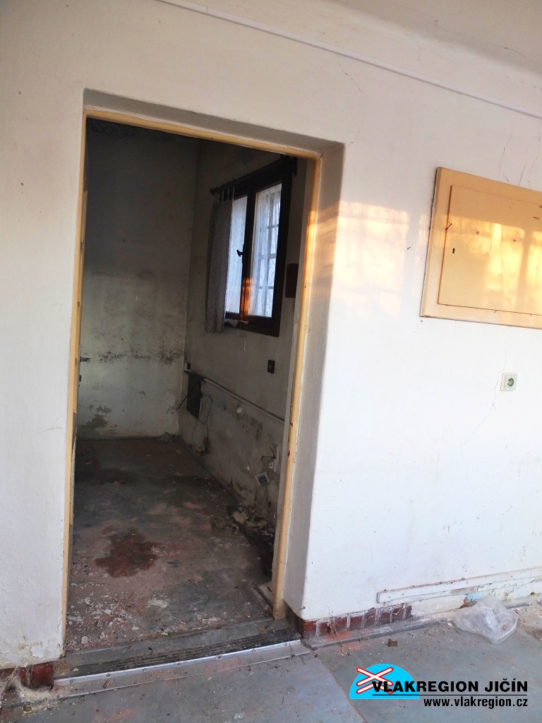 Bělá u Staré Paky - bývalá kancelář závoráře zeje prázdnotou a chátrá, bohužel sem i teče (3/2016)