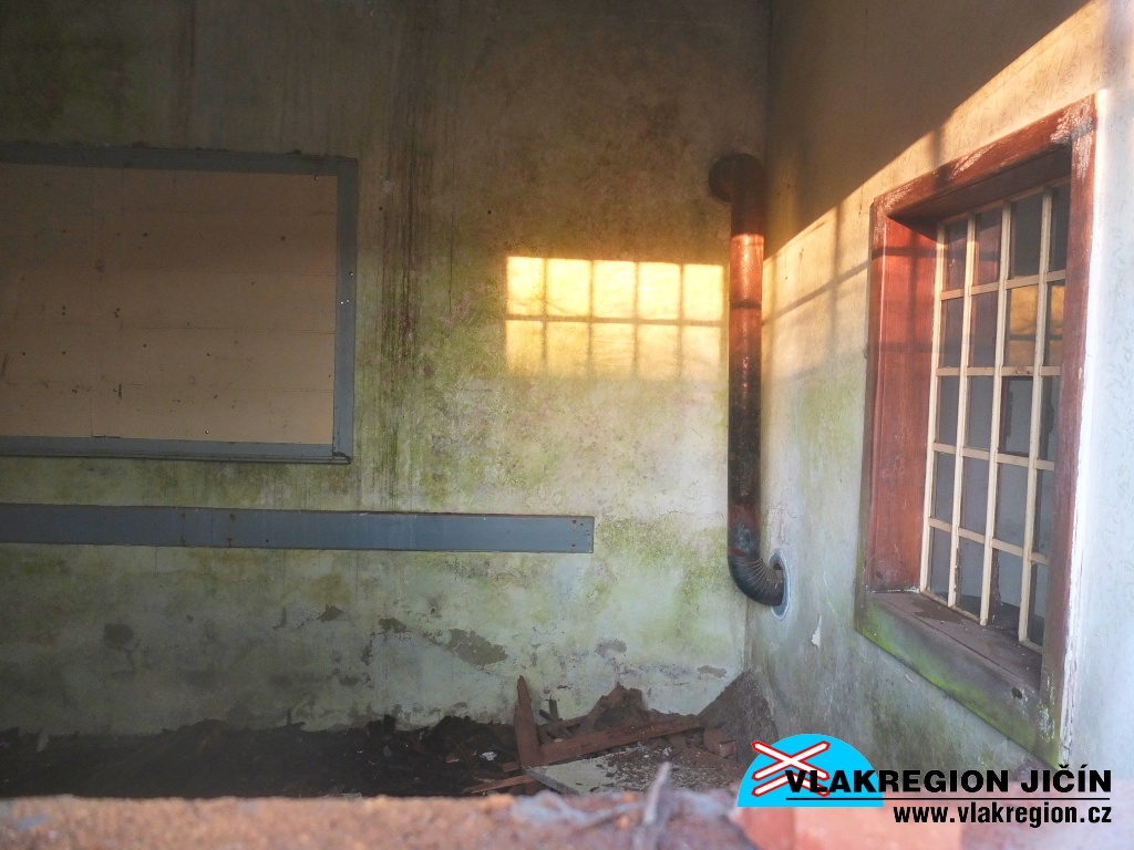 Bělá u Staré Paky - zdevastovaný interiér čekárny a výdejní okénko - v rohu originálně řešené vytápění čekárny (3/2016)