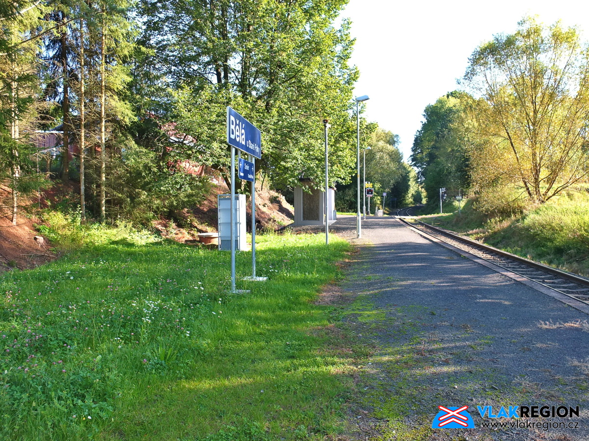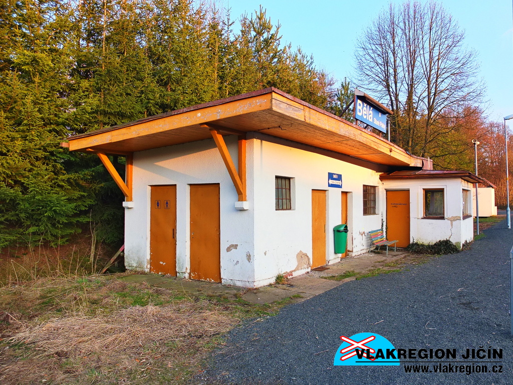 V říjnu 2023 byl původní objekt čekárny a závorářského stanoviště z roku 1939 zbořen. Nahradila ho stavba jednoduchého modulárního betonového čekárenského přístřešku (lidově typ „Antivandal“). Přístřešek tvaru 1xU má půdorysné rozměry 1,8 x 4 metry a valbovou střechu s dřevěnou konstrukcí o půdorysu 2,9 x 5,1 metrů. Krytina střechy je z plechových šablon imitující tašky. Přístřešek je v interiéru osvětlen a vybaven kamerou. Mobiliář tvoří lavička nesená na konzolách (umístěná na zadní stěně čekárny), vývěska na jízdní řády a odpadkový koš na směsný odpad. Na boku čekárny jsou dva stojany pro kola. Podlaha čekárny a prostor pro kola je vydlážděn a ohraničen betonovými obrubníky. Nástupiště má zastávka sypané štěrkodrtí s betonovou obrubou typu Tischer a jeho délka je 90 metrů. Na nástupiště je zajištěn bezbariérový přístup z místní komunikace. Zastávku osvětluje 5 nových šestimetrových osvětlovacích stožárů, ovládaných soumrakovým čidlem či dálkově z dispečerského terminálu. Funguje zde staniční rozhlas, který hlásí příjezdy a odjezdy vlaků. Zastávka obsluhuje hlavně přilehlou obec Bělá, od jejíhož centra leží asi 300 metrů, z turistického hlediska není zastávka nijak zajímavá.