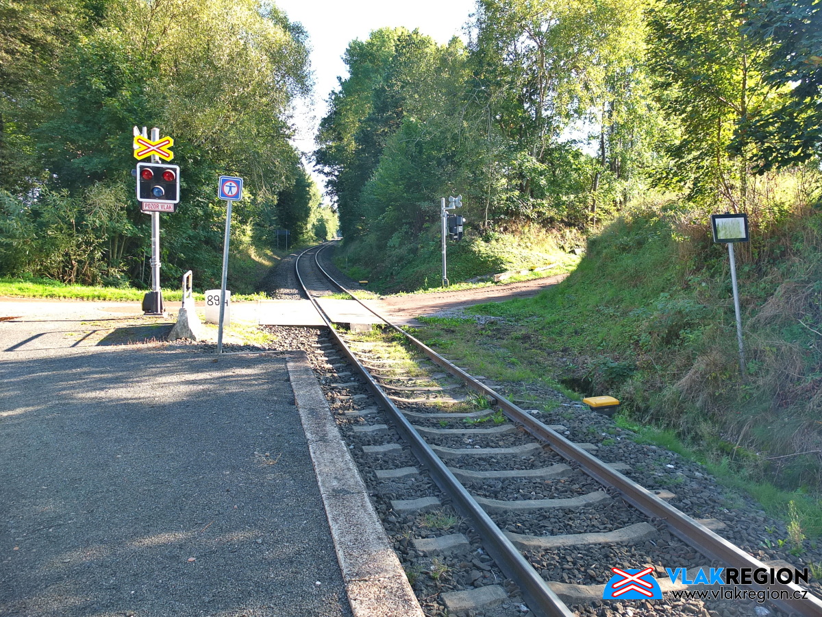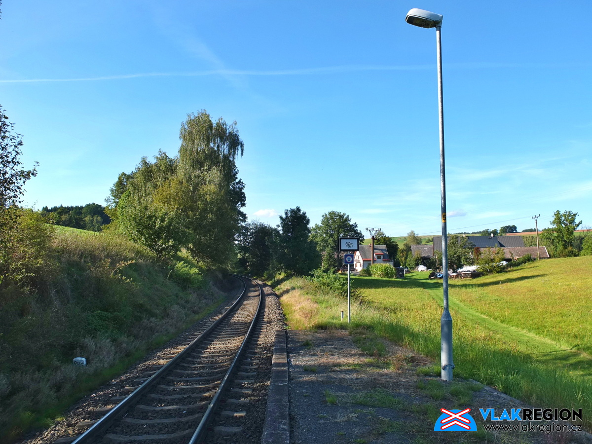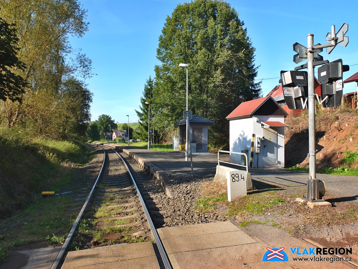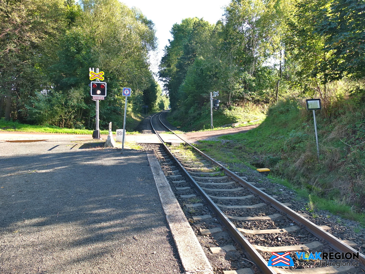 Bělá u Staré Paky - celkový pohled na zastávku z přejezdu (9/2025)