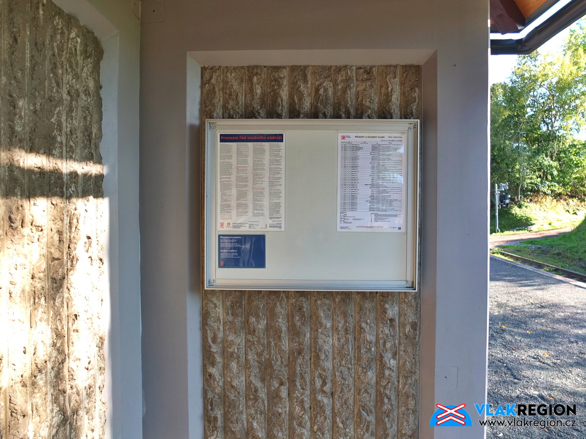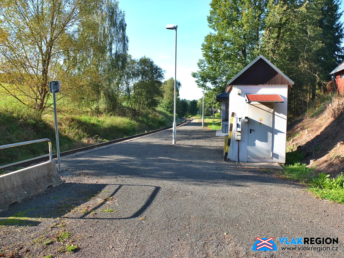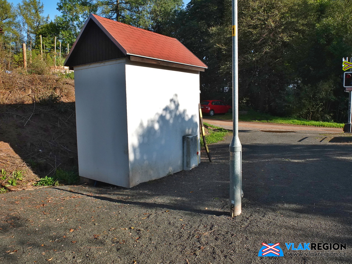 Do října 2023 měla zastávka jednoduchou nízkopodlažní nepodsklepenou zděnou budovu s čekárnou, toaletami a služební místností pro závoráře. Budova, postavená na zastávce v roce 1939, měla vnější rozměry 12,48 x 6,82 metrů a byla vybavena pultovou střechou. Před služební místností byla předsunutá, částečně prosklená veranda, kde bývala umístěna technologie pro obsluhu závor, a to jeden pohon pro závory na místní komunikaci na konci nástupiště zastávky. Mezi čekárnou a kanceláří závoráře bylo umístěno výdejní okénko, prostřednictvím kterého závorář zajišťoval prodej jízdenek až do roku 2005. Při postupné rekonstrukci a přechodu tratě na dálkové řízení v letech 2008–2015 bylo zrušeno i závorářské stanoviště a ručně ovládané závory byly nahrazeny automatickými. Vzhledem k tomu, že budova nebyla nadále využívána ani udržována, postupně se dostala do velmi špatného technického stavu.