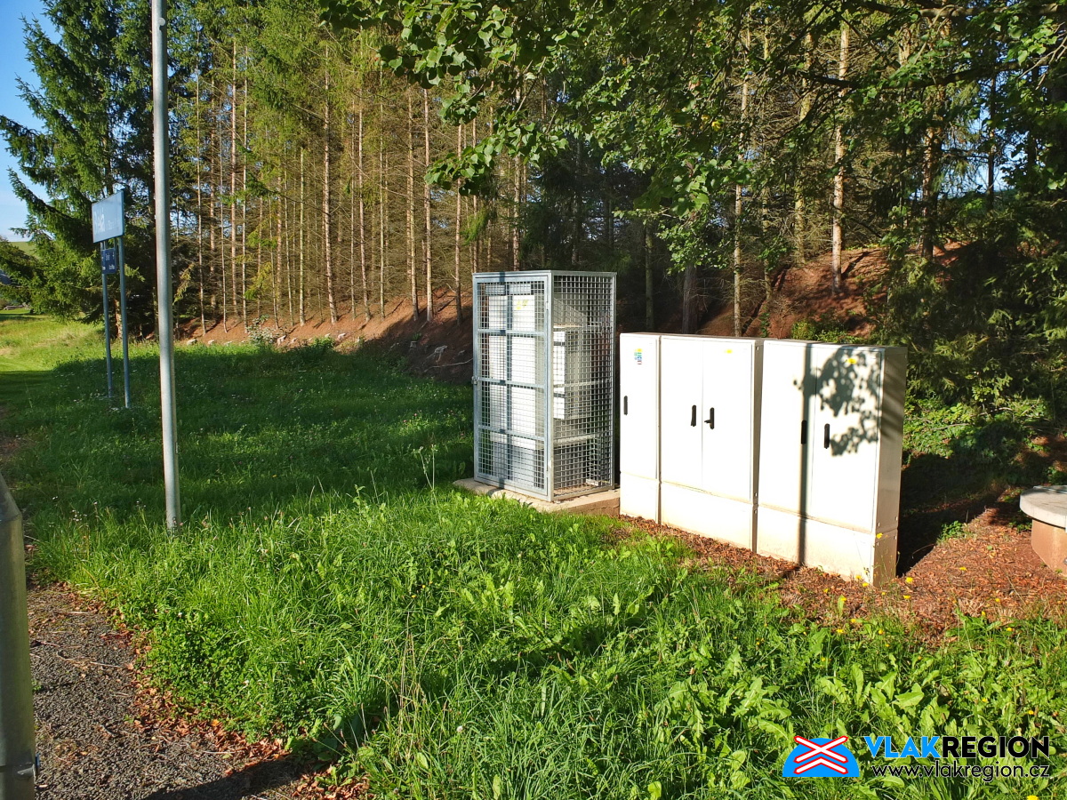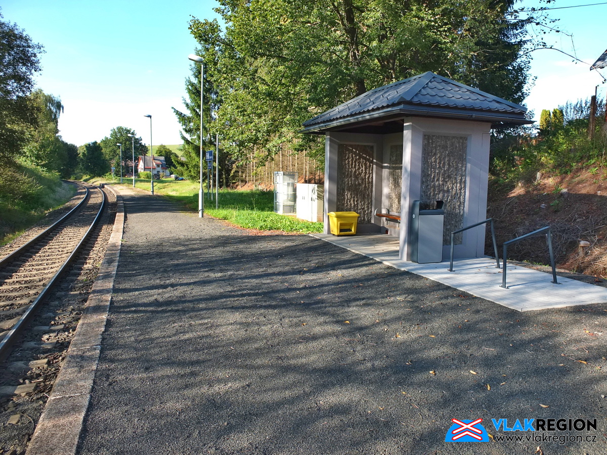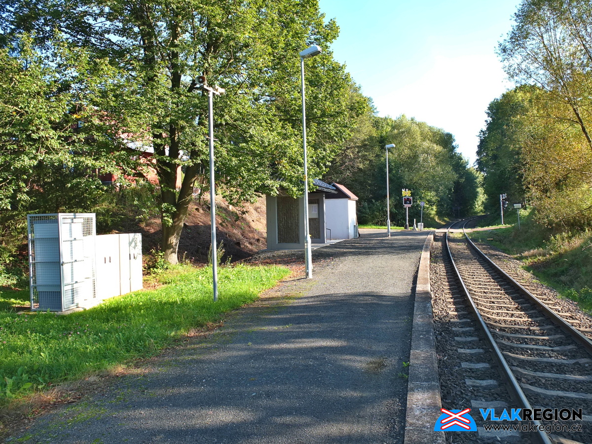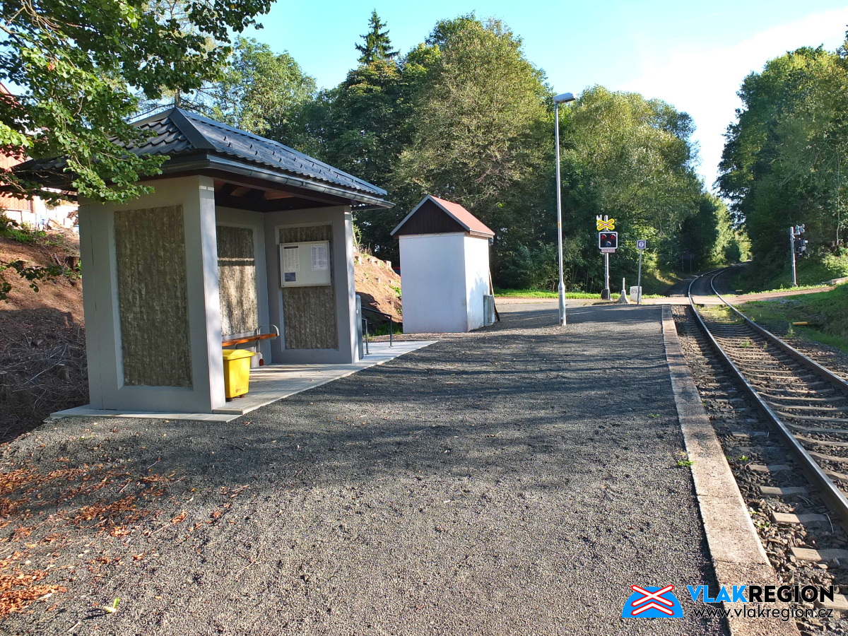 Do října 2023 měla zastávka jednoduchou nízkopodlažní nepodsklepenou zděnou budovu s čekárnou, toaletami a služební místností pro závoráře. Budova, postavená na zastávce v roce 1939, měla vnější rozměry 12,48 x 6,82 metrů a byla vybavena pultovou střechou. Před služební místností byla předsunutá, částečně prosklená veranda, kde bývala umístěna technologie pro obsluhu závor, a to jeden pohon pro závory na místní komunikaci na konci nástupiště zastávky. Mezi čekárnou a kanceláří závoráře bylo umístěno výdejní okénko, prostřednictvím kterého závorář zajišťoval prodej jízdenek až do roku 2005. Při postupné rekonstrukci a přechodu tratě na dálkové řízení v letech 2008–2015 bylo zrušeno i závorářské stanoviště a ručně ovládané závory byly nahrazeny automatickými. Vzhledem k tomu, že budova nebyla nadále využívána ani udržována, postupně se dostala do velmi špatného technického stavu.