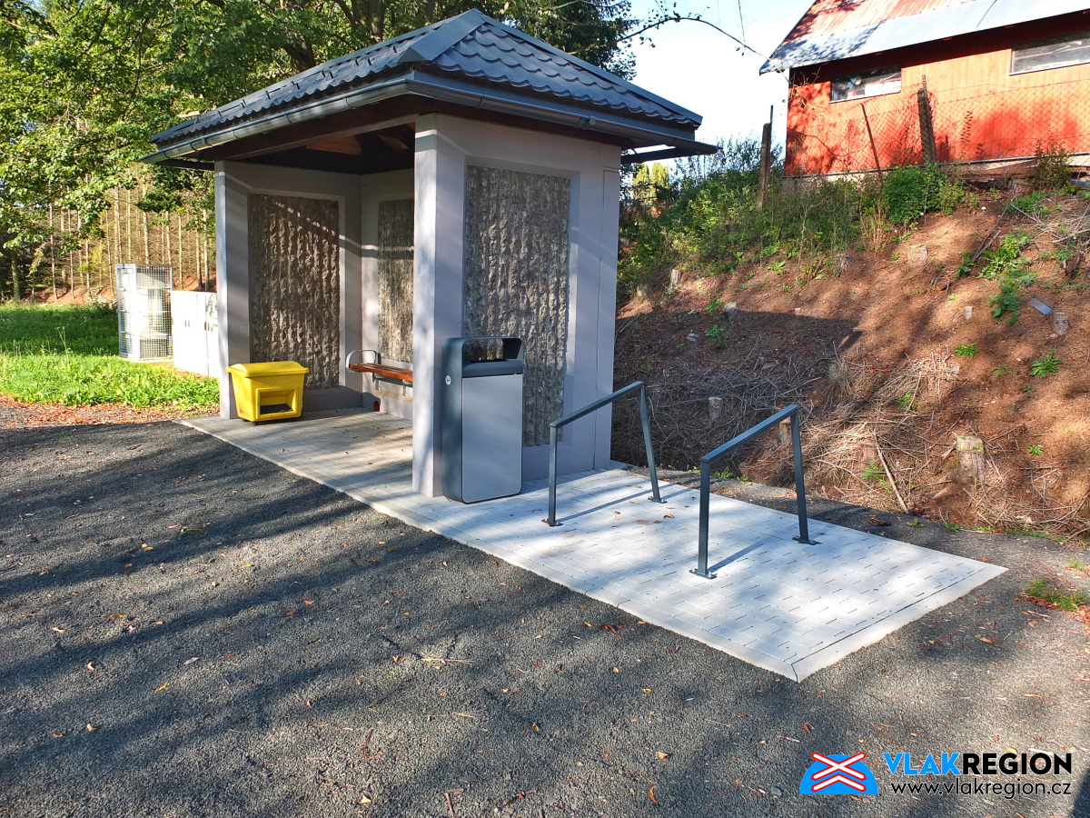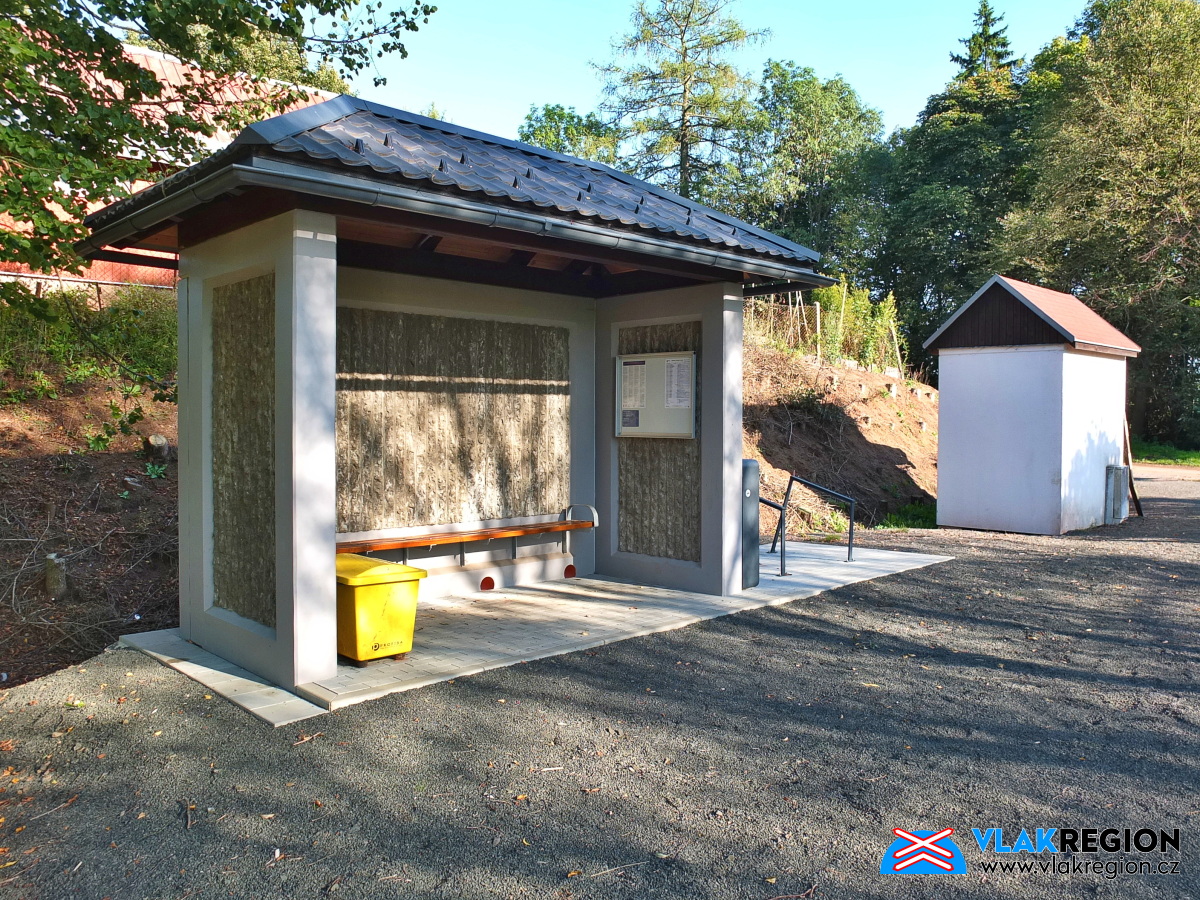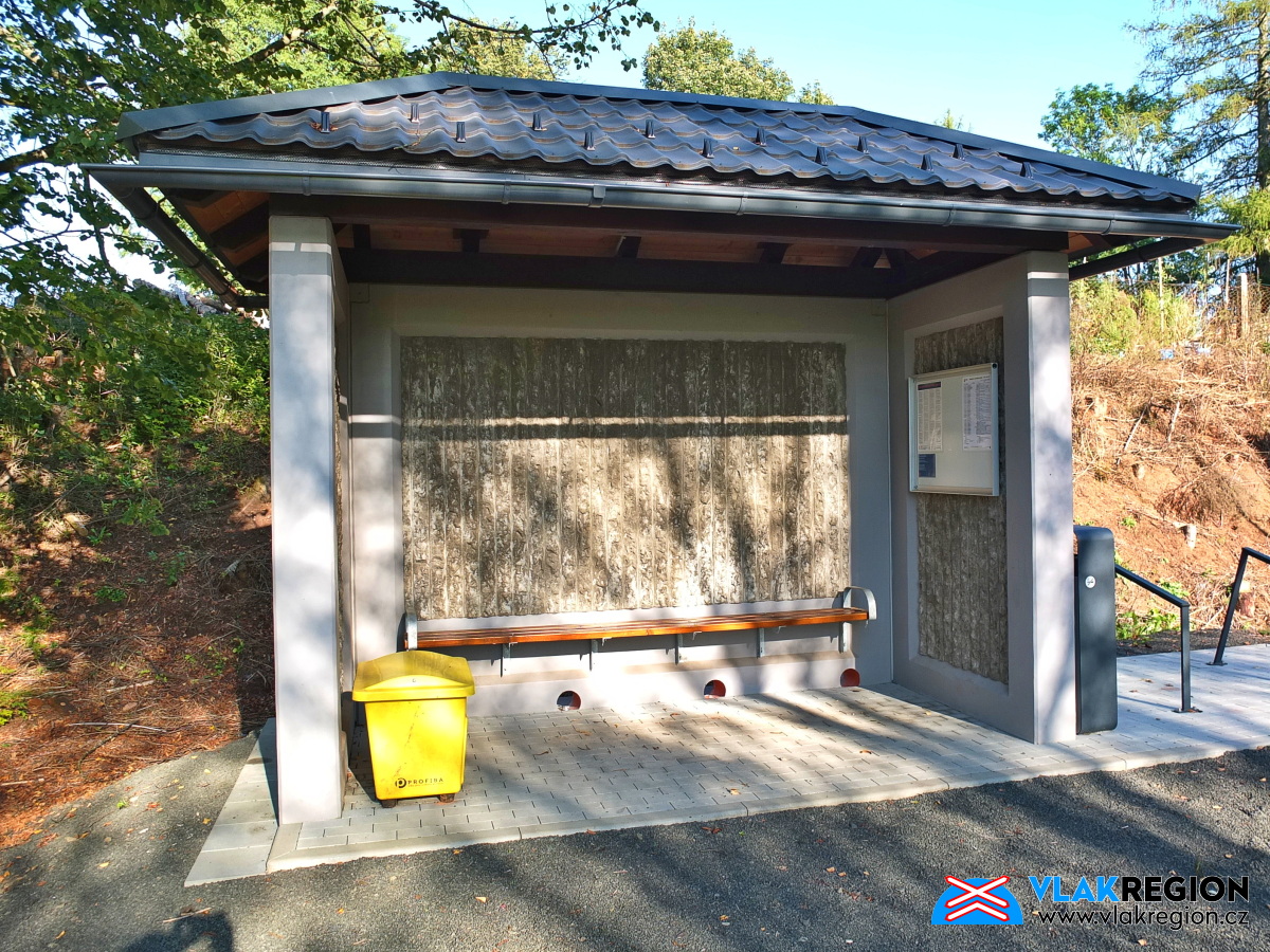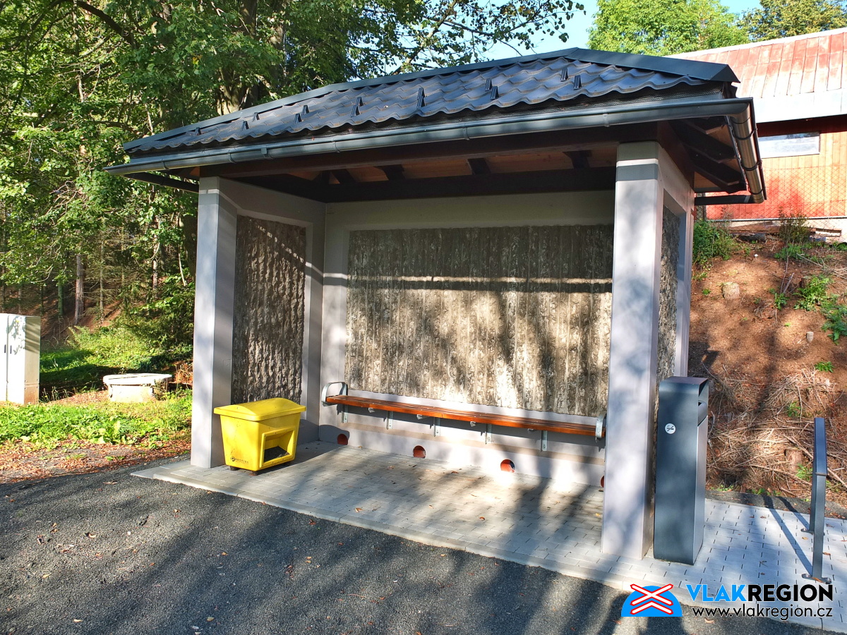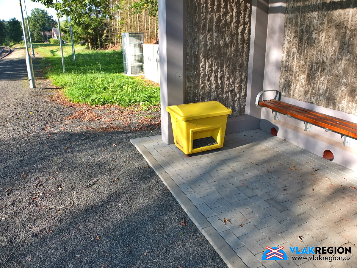 Bělá u Staré Paky - pohled na zastávku s novou čekárnou (9/2025)