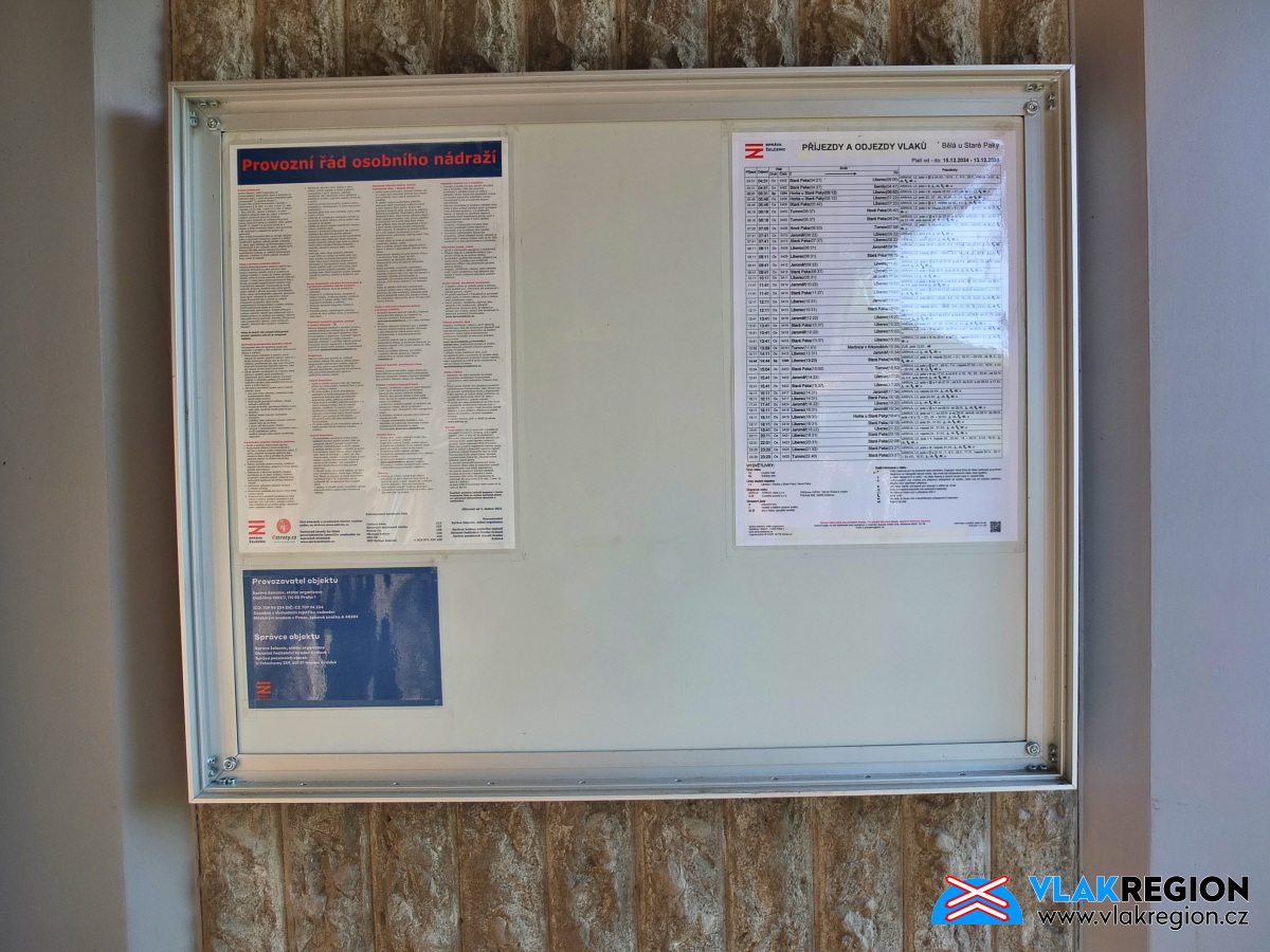 Bělá u Staré Paky - mobiliář tvoří konzolová lavička, vývěska, odpadkový koš a bedna na posyp (9/2025)
