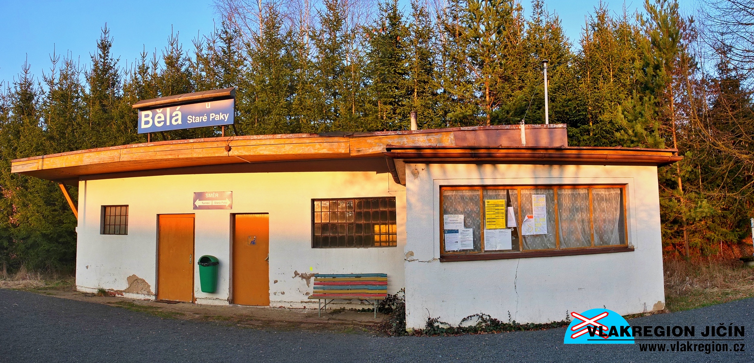 Zastávka je situována nad stejnojmennou obcí přibližně 400 metrů od jejího centra. Pozoruhodné je, že v této malé obci se nacházejí dvě vlakové zastávky, každá je situovaná na odlišné železniční trati, přičemž jejich vzájemná vzdálenost činí pouhých 250 metrů. Naše popisovaná zastávka leží nad obcí ve stráni na trati 030 (Jaroměř – Liberec) a jmenuje se „Bělá u Staré Paky“, druhá pak blízko centra obce na trati 040 (Chlumec nad Cidlinou – Trutnov) a jmenuje se „Bělá u Staré Paky zastávka“.