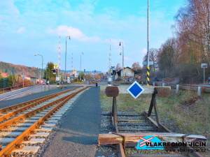 Stanice Košťálov - nahoře vlečková kolej, dole dopravní kolej směr Turnov (3/2016)