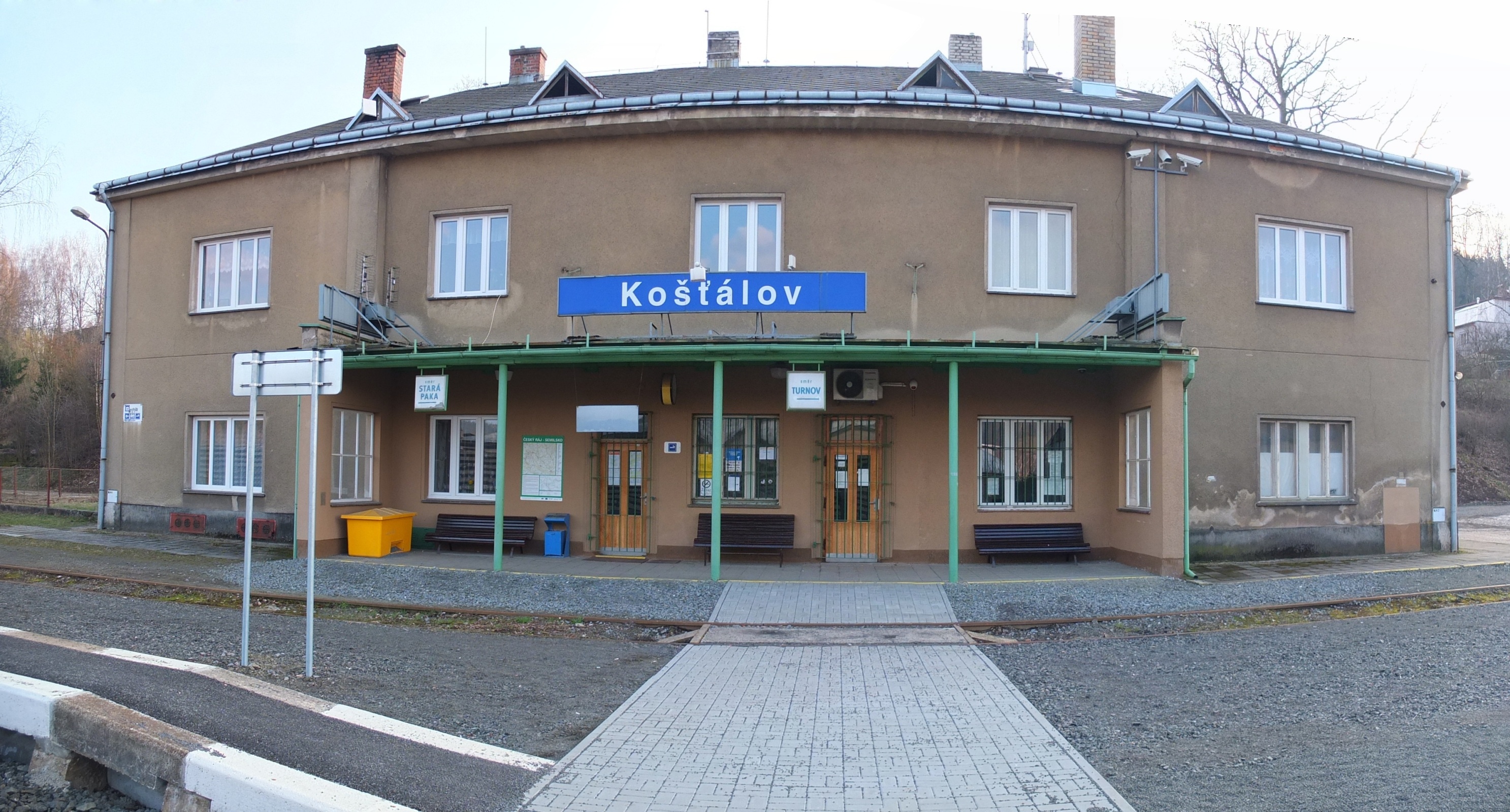 Stanice Košťálov - čelní pohled na budovu stanice a na verandu (3/2016)
