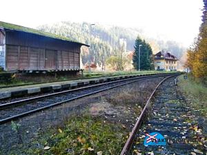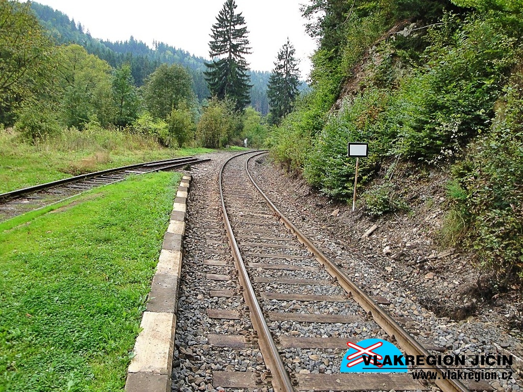 Větší část bývalé stanice leží v ostrém oblouku trati - vpravo výkolejka manipulační koleje a nástupiště(10/2013)