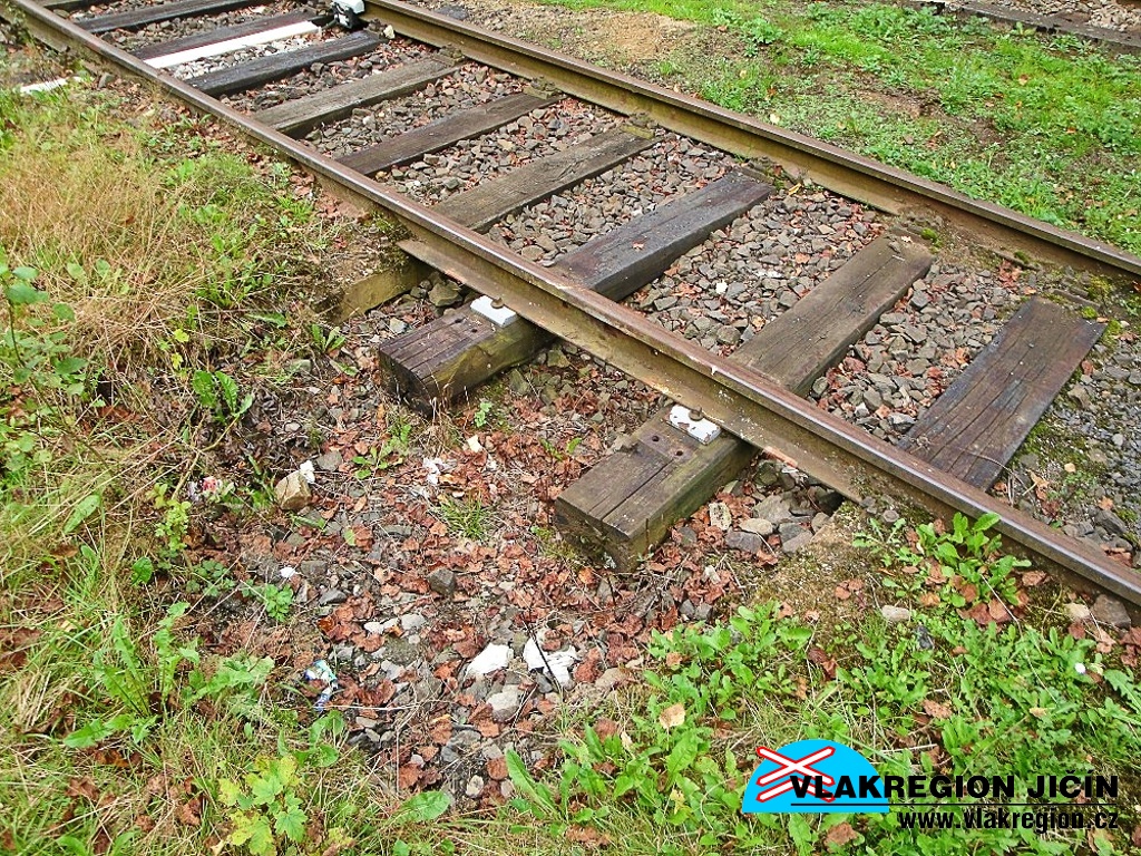 Výkolejka u bývalé staniční koleje č. 3 /druhé dopravní/ zároveň kolej za ní vyloučena návěstidlem (10/2013)