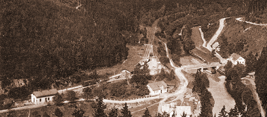 Původní historická fotografie z 90. let s ještě existujícím krakorcem nad oběma dopravníma kolejema, v pozadí existující WC a starší lampy