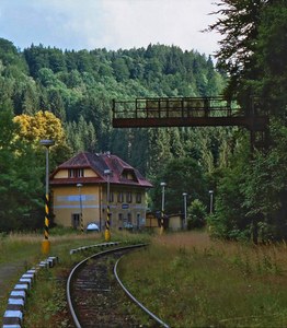 Bývalé výpravní budova leží blíže železnobrodského zhlaví v oblouku trati (10/2013)