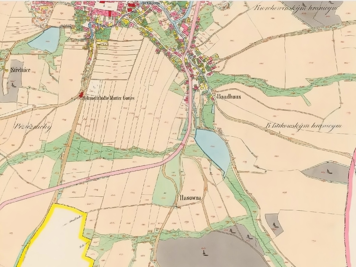 Stanice Nová Paka - mapa z roku 1842 - ukazuje velkou plochu rybníka Šibeničák, který byl z velké části při výstavbě zasypán (Český úřad zeměměřický a katastrální)