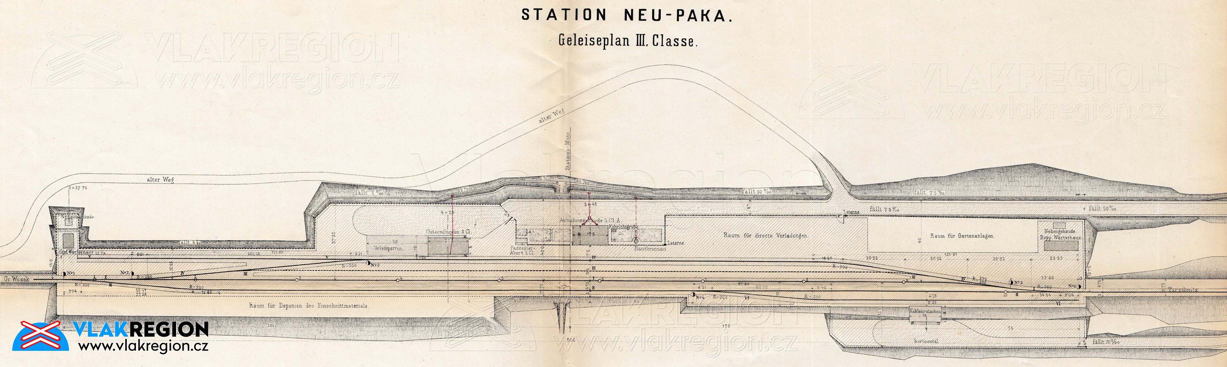 Mapa stanice Nová Paka z roku 1871 - na plánu je vidět dlouhá odstavná kolej na ostroměřské straně stanice a i do budoucna plánovaná čtvrtá kolej (st.č.3), ta však byla dostavěna až v roce 1909 (sbírka Zdeněk Hrdina)