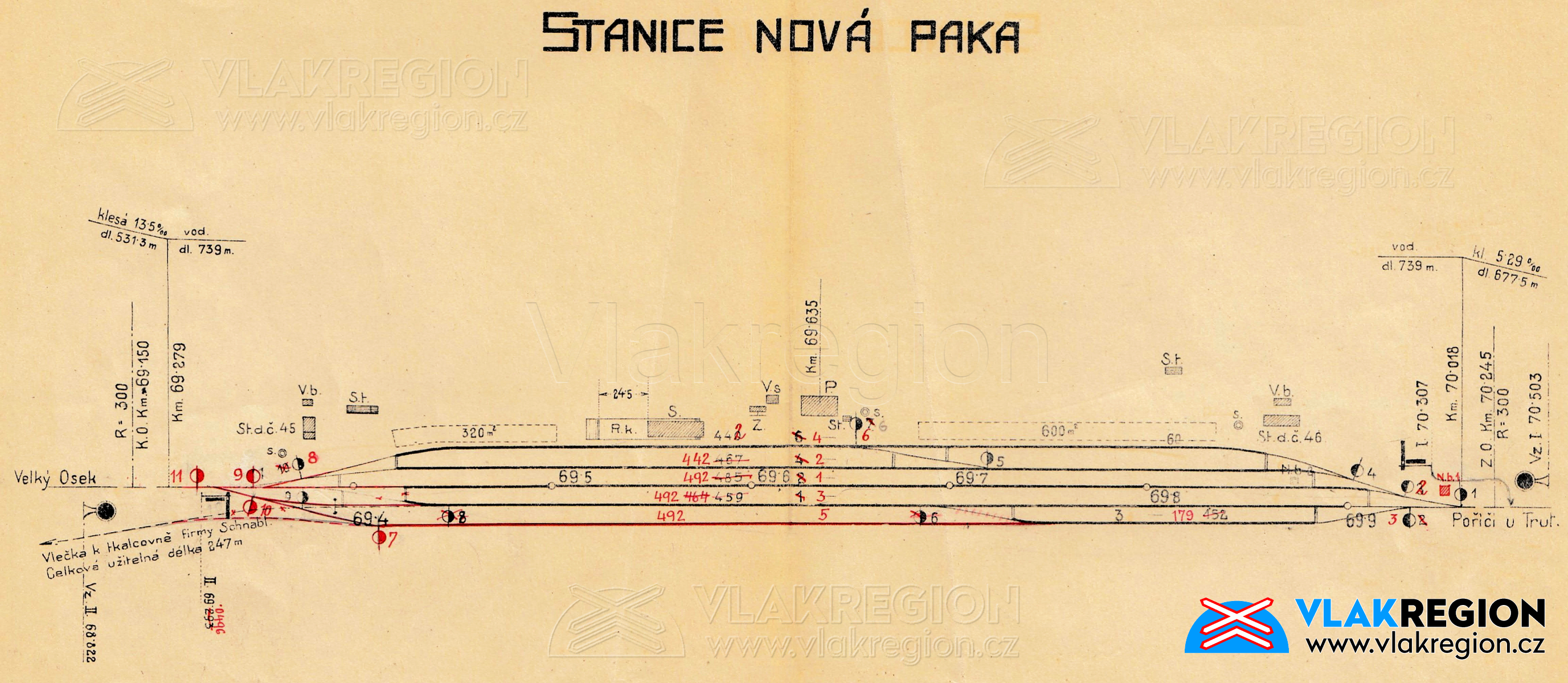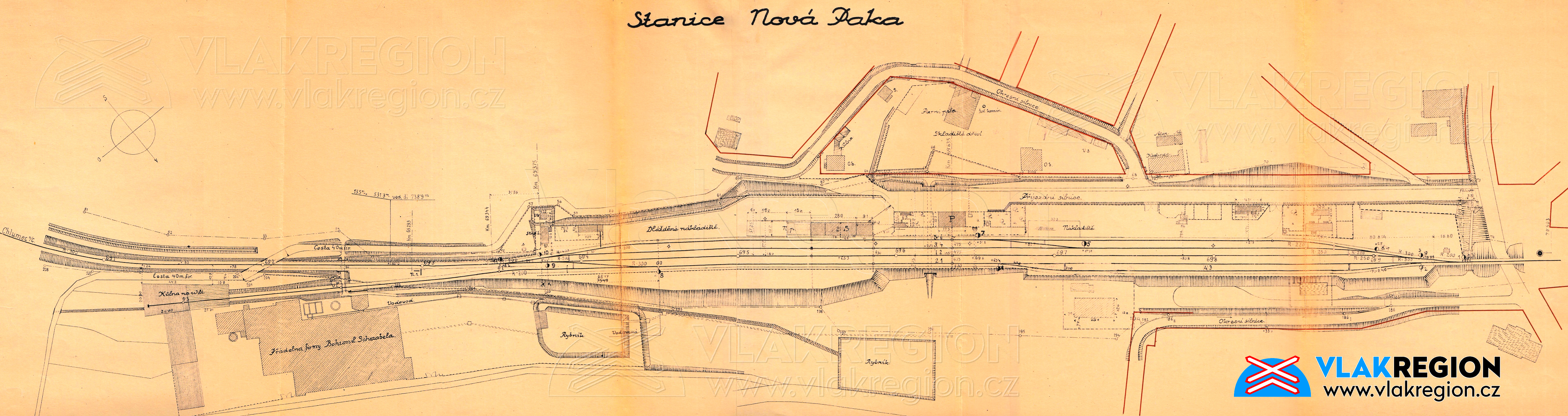Mapa stanice Nová Paka z roku 1931 - upravené je již ostroměřské zhlaví a prodloužena uhelka jako pátá kolej, do ní je pak nově zapojena vlečka Schnabel, vidět je i červeně značené přečíslování kolejí z následujícího roku