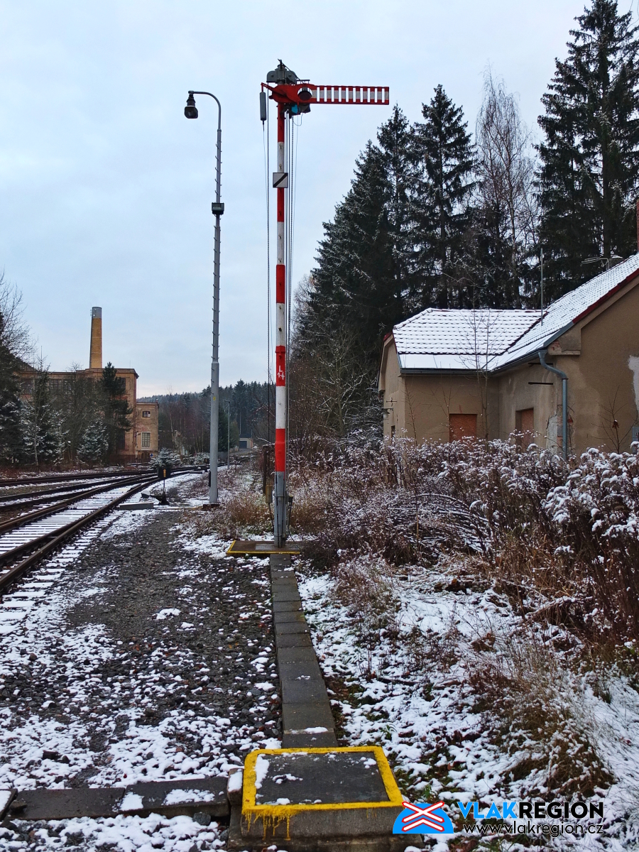Stanice Nová Paka - mechanické odjezdové návěstidlo na ostroměřském zhlaví a dnes již neexistující původní strážní domek č.45 (11/2021)