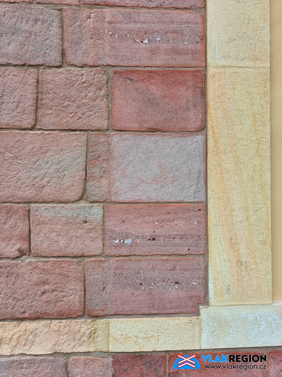 Stanice Nová Paka - detail fasády, při přestavbě došlo k narušení původního kamenného obkladu,dveře na boku (průchod z čekárny k výdejním okénkům) budou zazděny (11/2021)