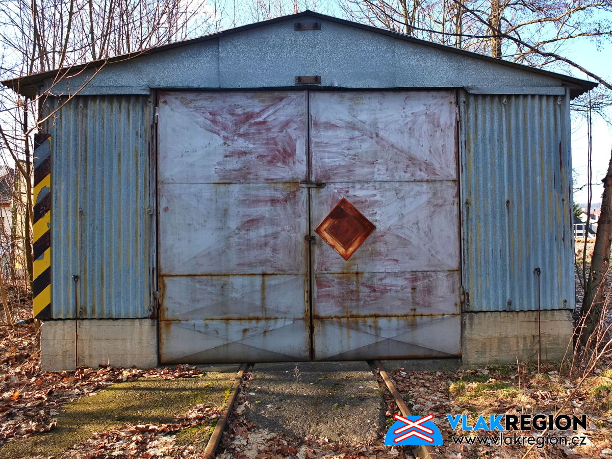 Stanice Nová Paka - pohled od silnice k plechové garáži pro drezínu (2/2026)