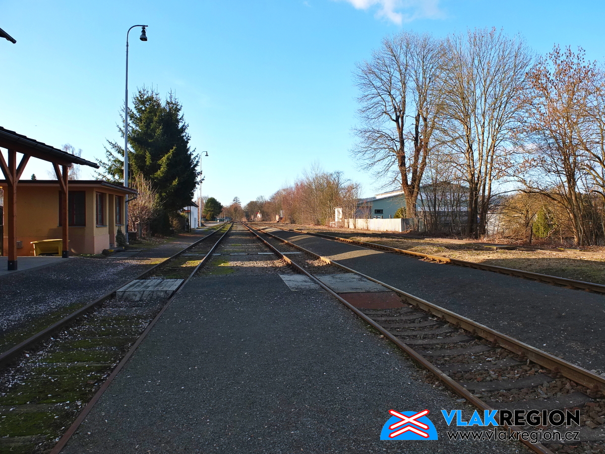 Stanice Nová Paka - pohled podél dopravní koleje do nádraží (2/2026)