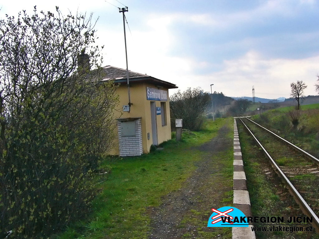 Semínova Lhota je malá mezilehlá zastávka na návrší nad stejnojmennou obcí, ležící u přejezdu. Zastávka leží v rovném úseku trati a obsluhuje stejnojmennou obec a přilehlé osady. V době stavby tratě, v roce 1903, žádal starosta 2 km vzdálené obce Újezd pod Troskami stavební komisi o zřízení zastávky v osadě Lhota Semínská, v té době byla dochozí vzdálenost 2 km poměrně běžná. Přesto, že by zastávka obsluhovala nejen Semínovu Lhotu, ale i mnohem větší Újezd pod Troskami, komise posoudila žádost jako neodůvodněnou, protože akční rádius je příliš malý. Ke stavbě zastávky tak došlo až mnohem později, a to v roce 1957. Zastávka leží asi 300 metrů od obce Semínova Lhota a s obcí ji spojuje silnička vedoucí do Rovenska pod Troskami, která také na rovenské straně zastávky trať překračuje přejezdem.