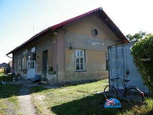 Budovy bývalé stanice - v popředí zarostlá výhybka manipulačních kolejí (6/2010)