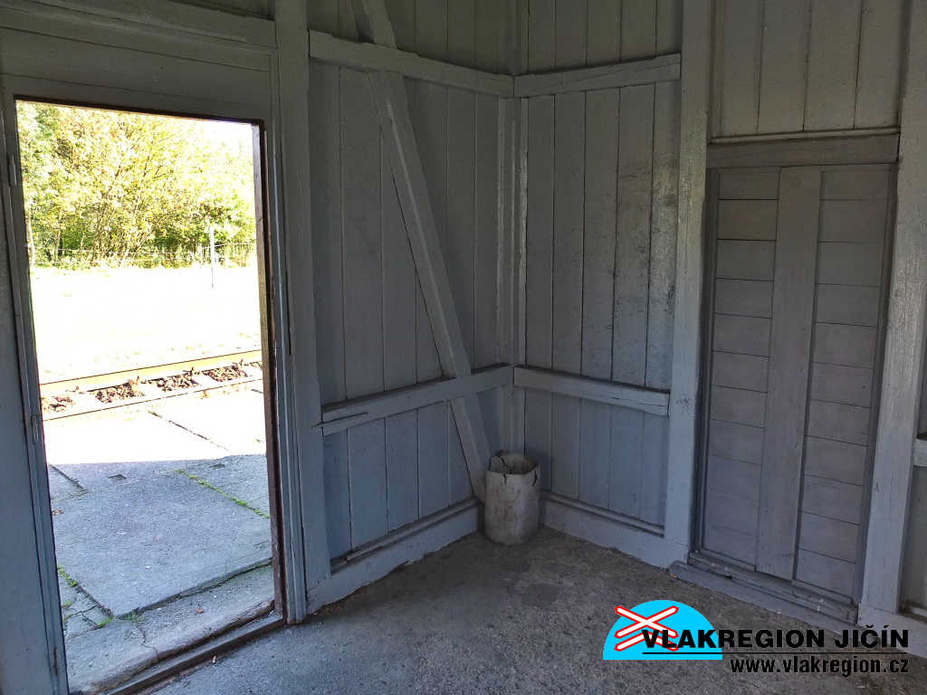 Vstup do jednoduché dřevěné čekárny zastávky Bechov (9/2017)