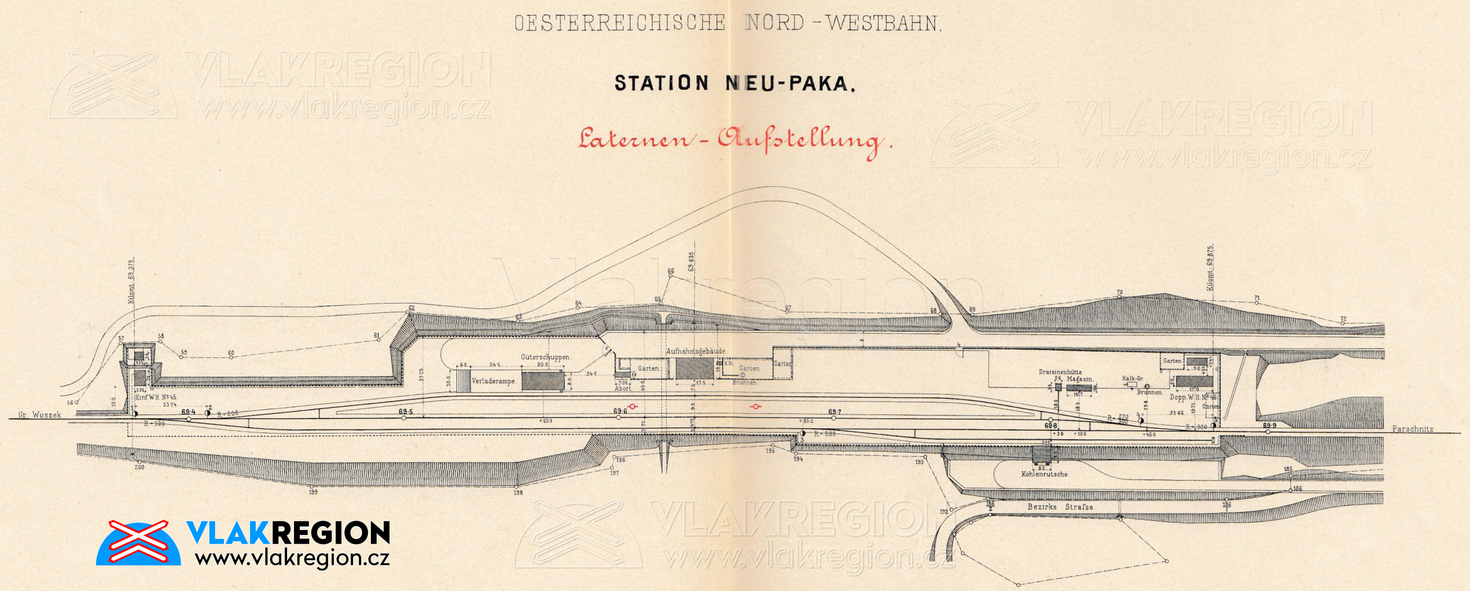 Mapa stanice Nová Paka z roku 1871 - na plánu je vidět dlouhá odstavná kolej na ostroměřské straně stanice a i do budoucna plánovaná čtvrtá kolej (st.č.3), ta však byla dostavěna až v roce 1909 (sbírka Zdeněk Hrdina)