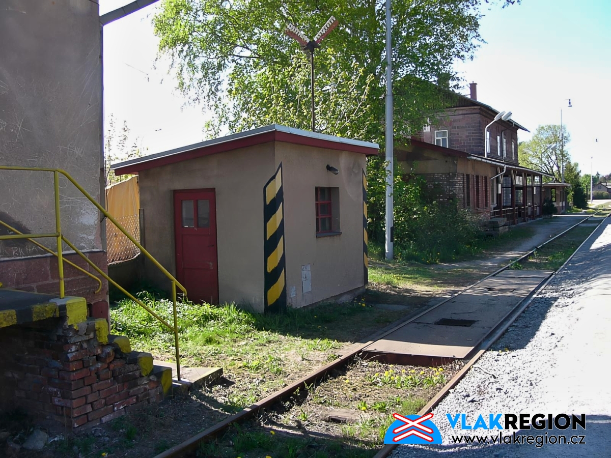 Stanice Nová Paka - kolejová váha a vážní domek mezi skladem a výpravní budovou, později bude váha demontována a domek zmizí spolu s přístavbami (4/2007)