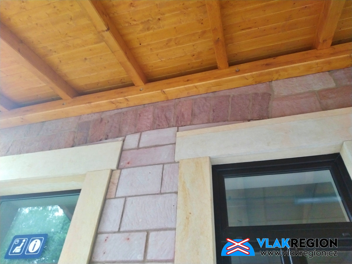 Stanice Nová Paka - detail fasády, při přestavbě došlo k narušení původního kamenného obkladu,dveře na boku (průchod z čekárny k výdejním okénkům) budou zazděny (11/2021)