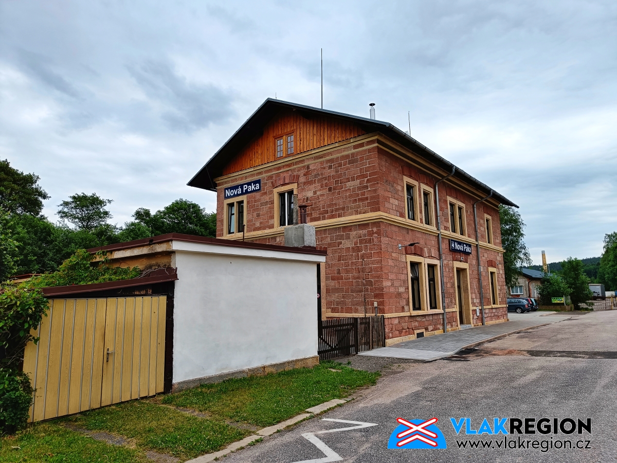 Stanice Nová Paka - celkový pohled na krásně opravenou budovu (6/2022)