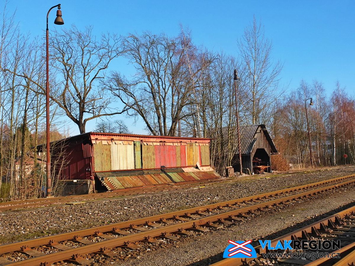 Stanice Nová Paka - pohled od silnice k plechové garáži pro drezínu (2/2026)