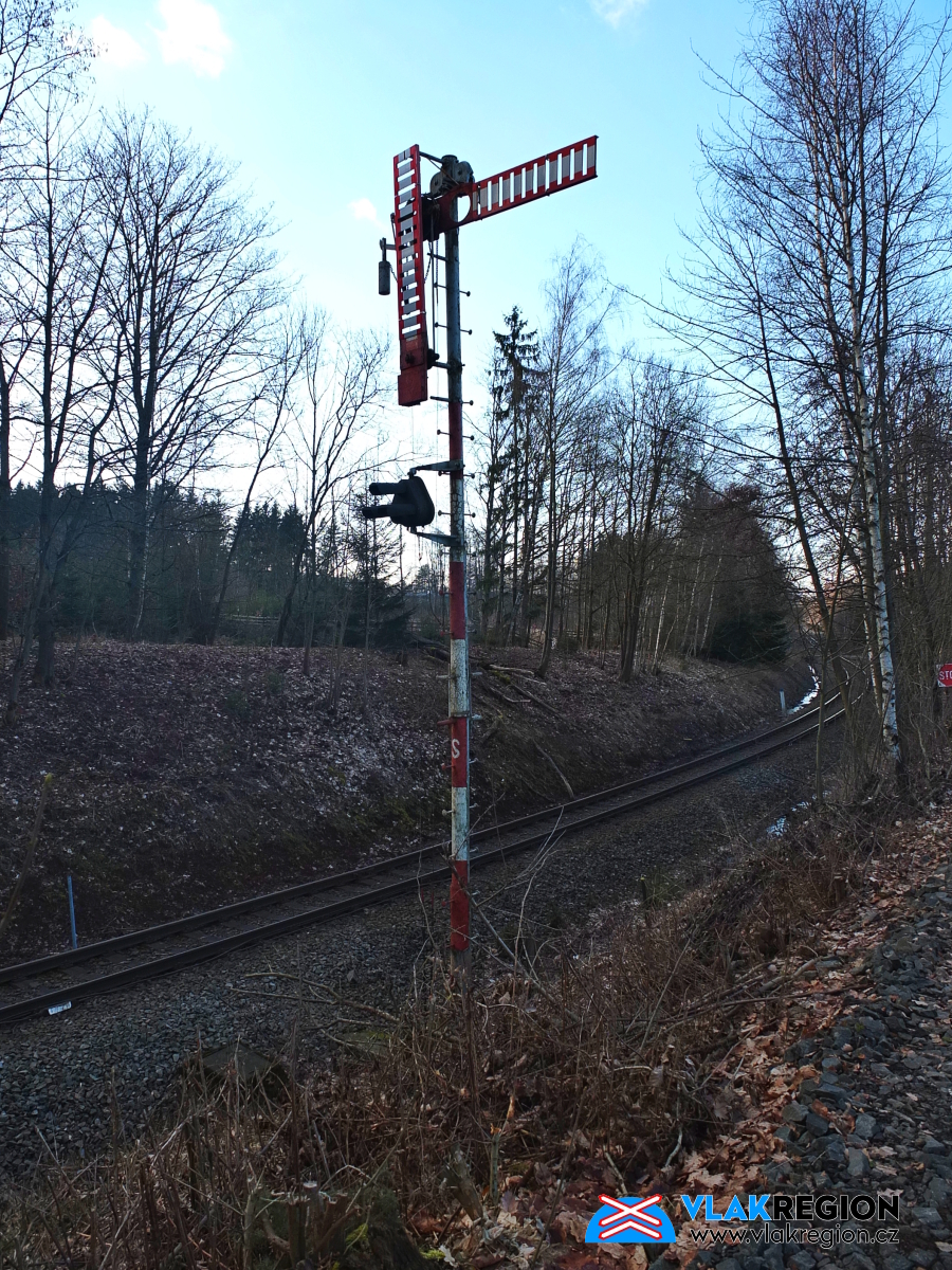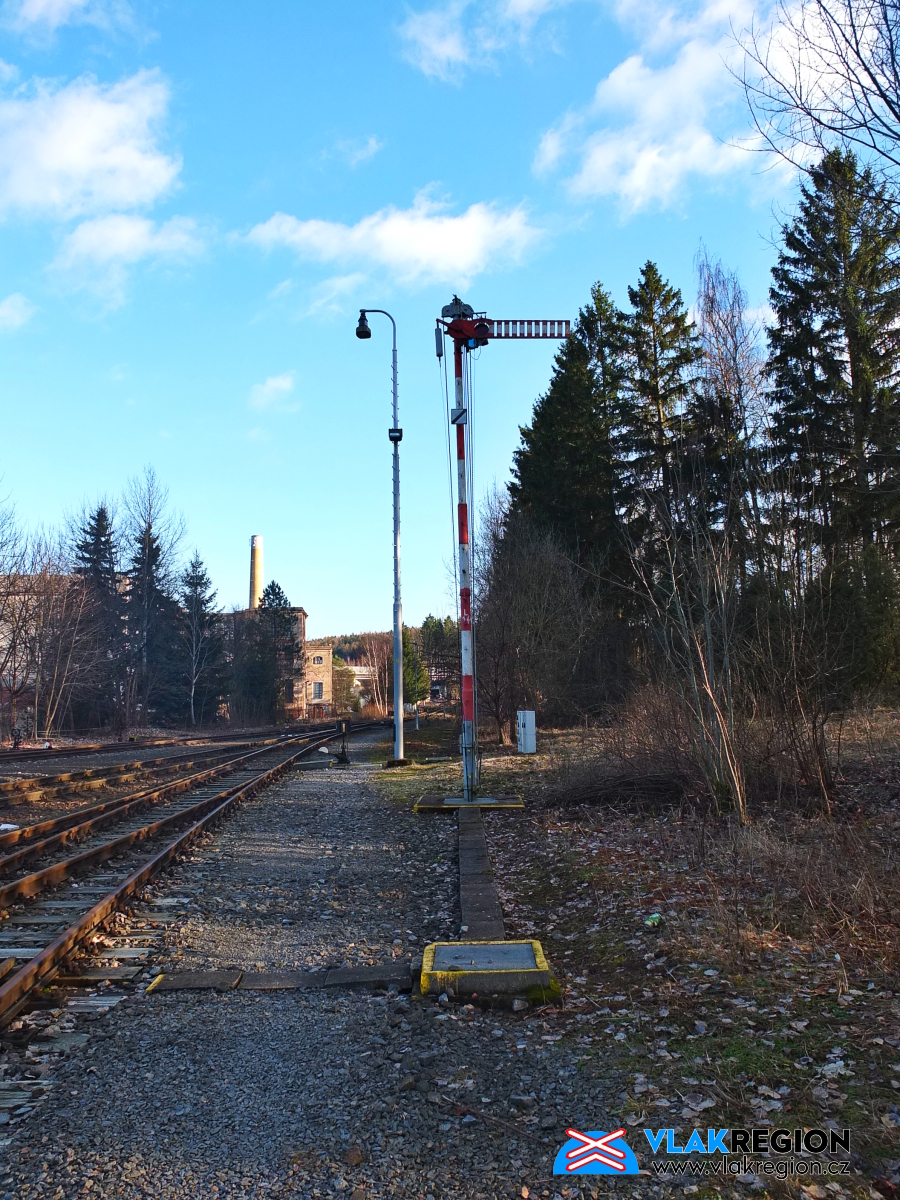 Stanice Nová Paka - dnes již vzácné mechanické návěstidlo na ostroměřské straně stanice, vpravo stával strážní domek č. 46, v pozadí přádelna Velveta (02/2026)