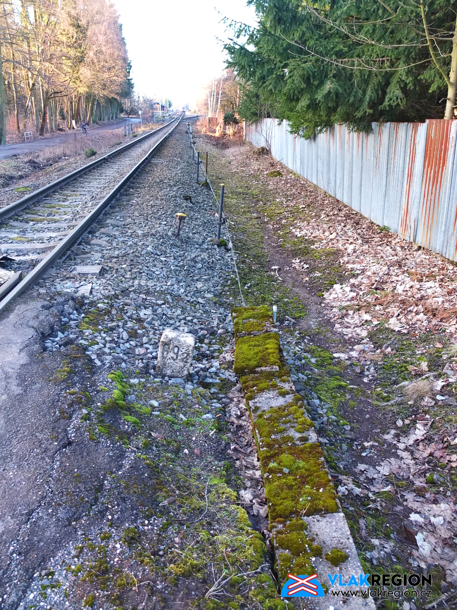 Stanice Nová Paka - traťová kolej směr Ostroměř, za ní ropadající se šturc krátké odstavné koleje (2/2026)