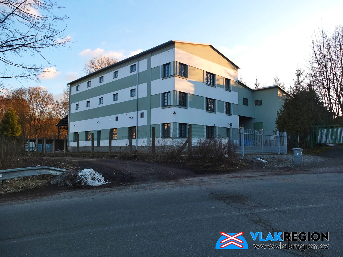 Stanice Nová Paka - nádražní budova po rekonstrukci, v popředí ústřední stavědlo, v pozadí sklad (2/2026)