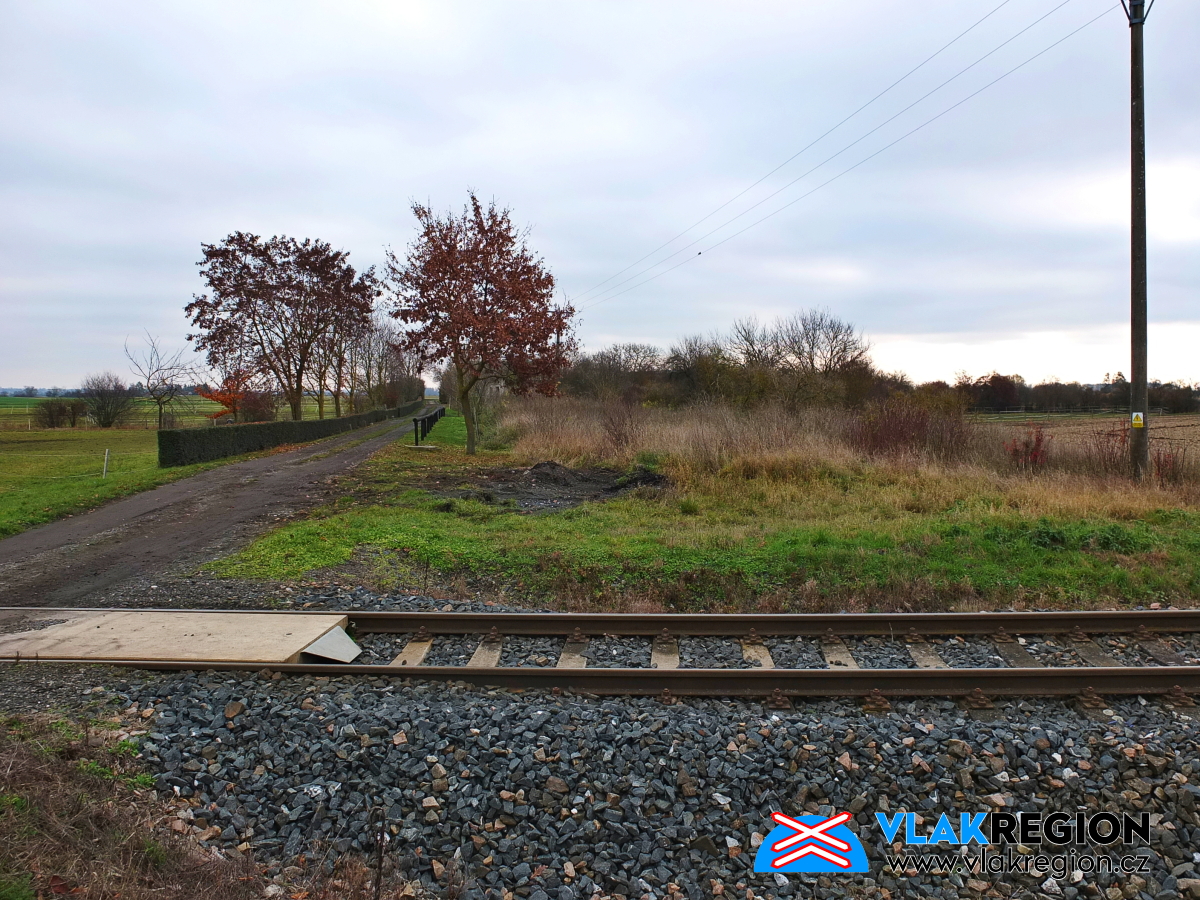 Vlečka Fachner - Podchotucký mlýn - přejezd a před ním vpravo stával strážní domek č.4 (11/2025)