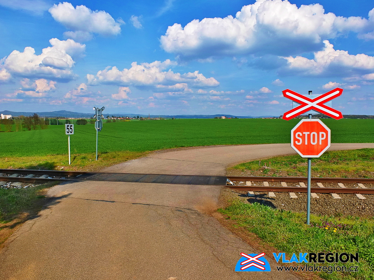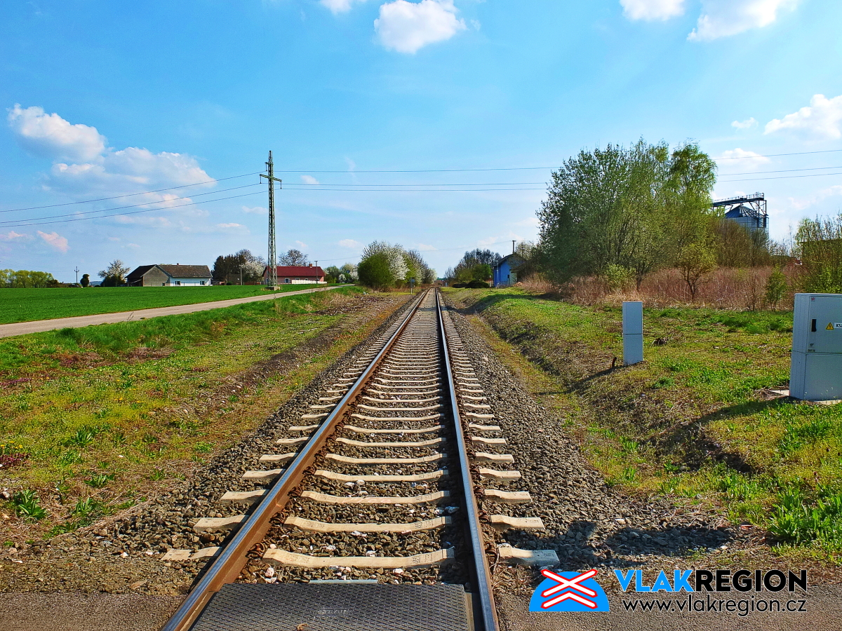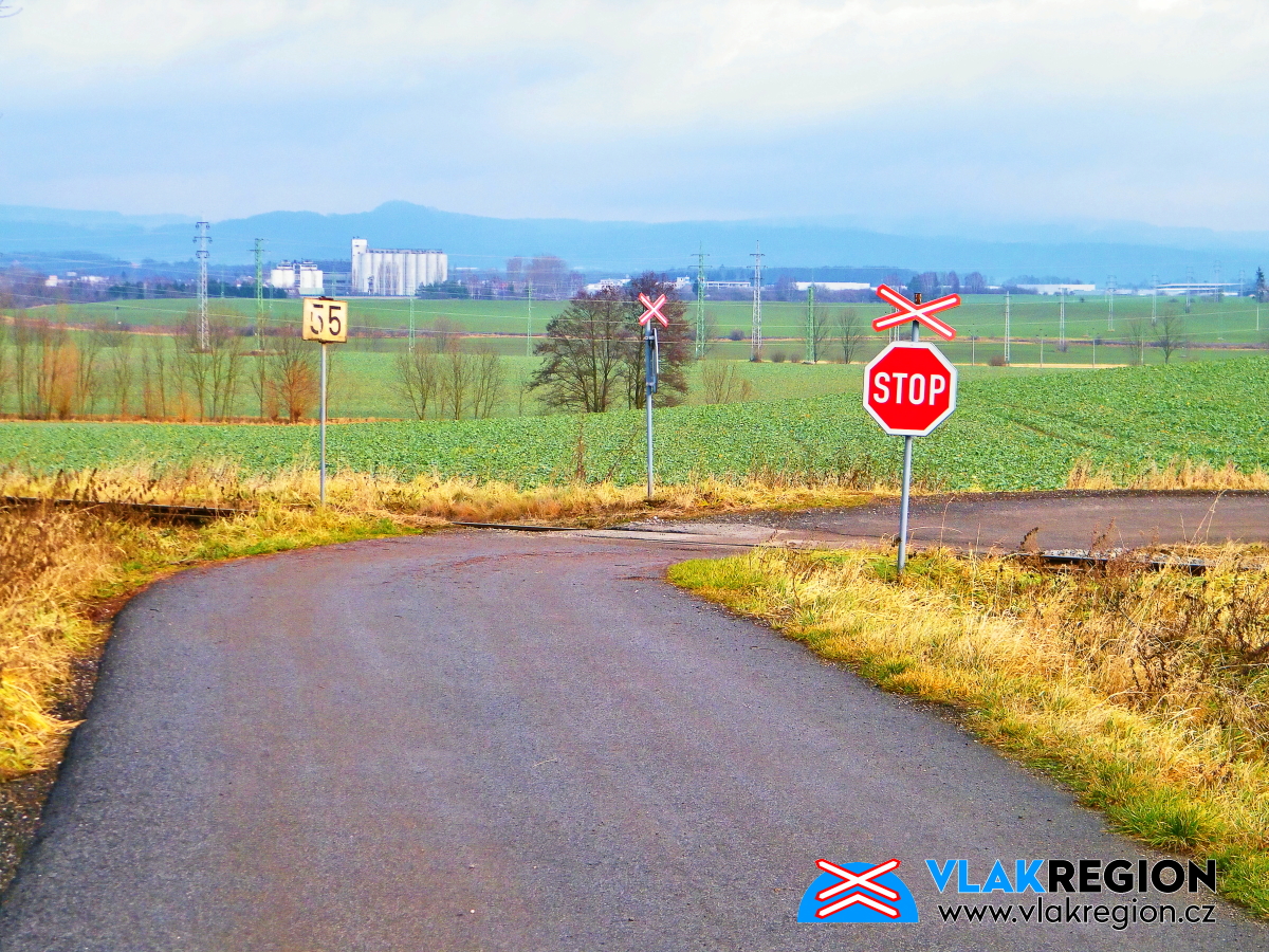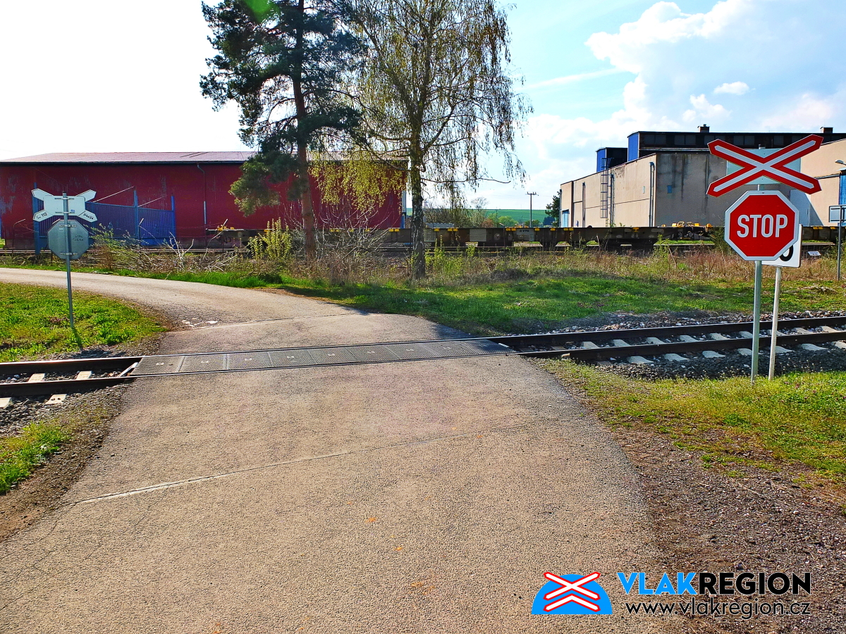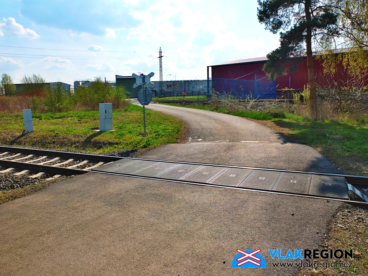 Staré Místo u Jičína - vpravo trojkolejný přejezd k zastávce a vlevo k Agroponiku a polosamotám (4/2025)