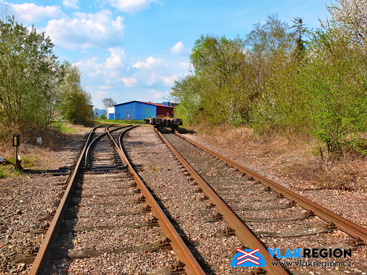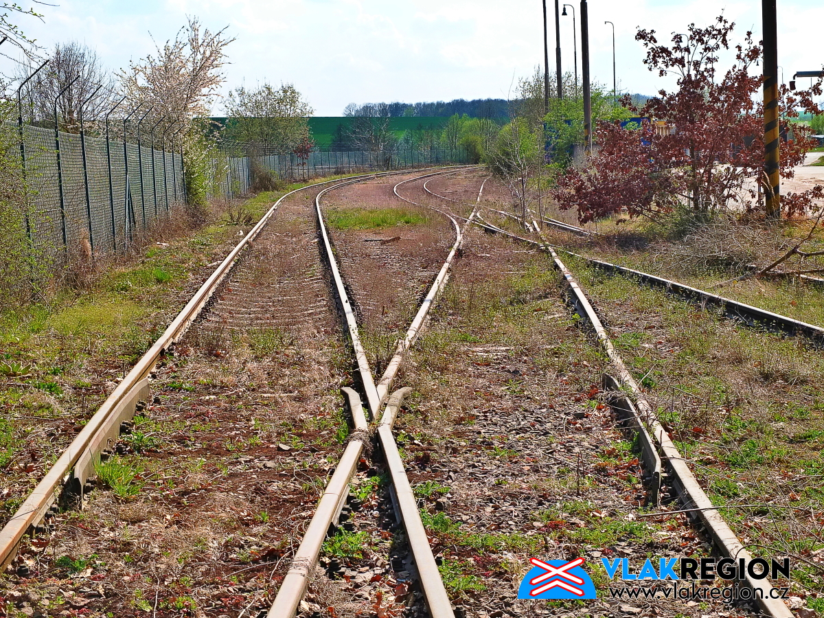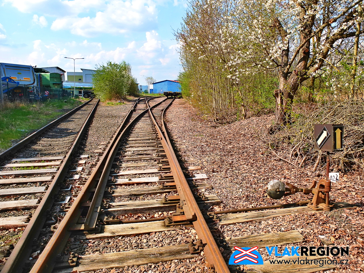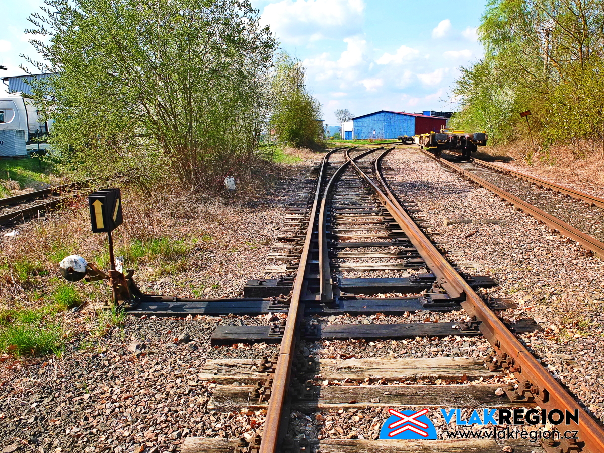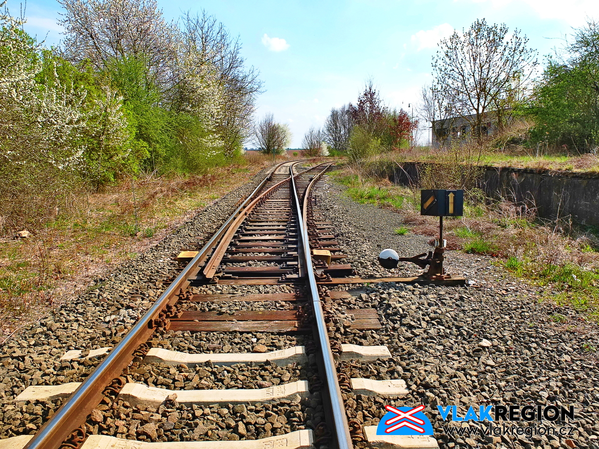 Staré Místo u Jičína - zpětný pohled na výhybku rozdělující obě vlečky (4/2025)